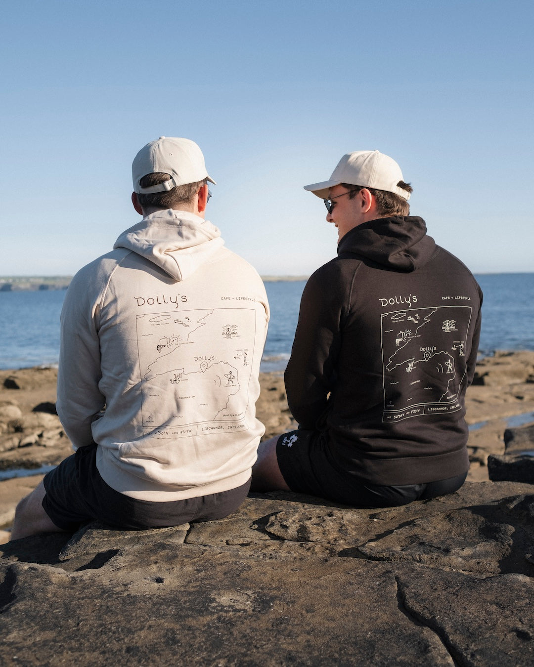 Our unisex Dolly's Map Hoodie comes in our signature cream and black colours. Artwork on the back is by local designer ODYSEA Design.