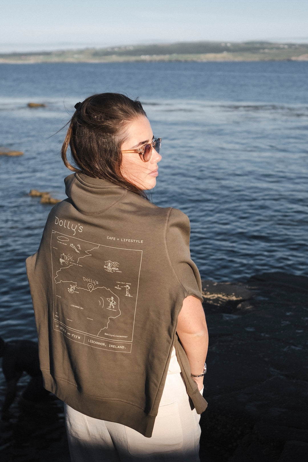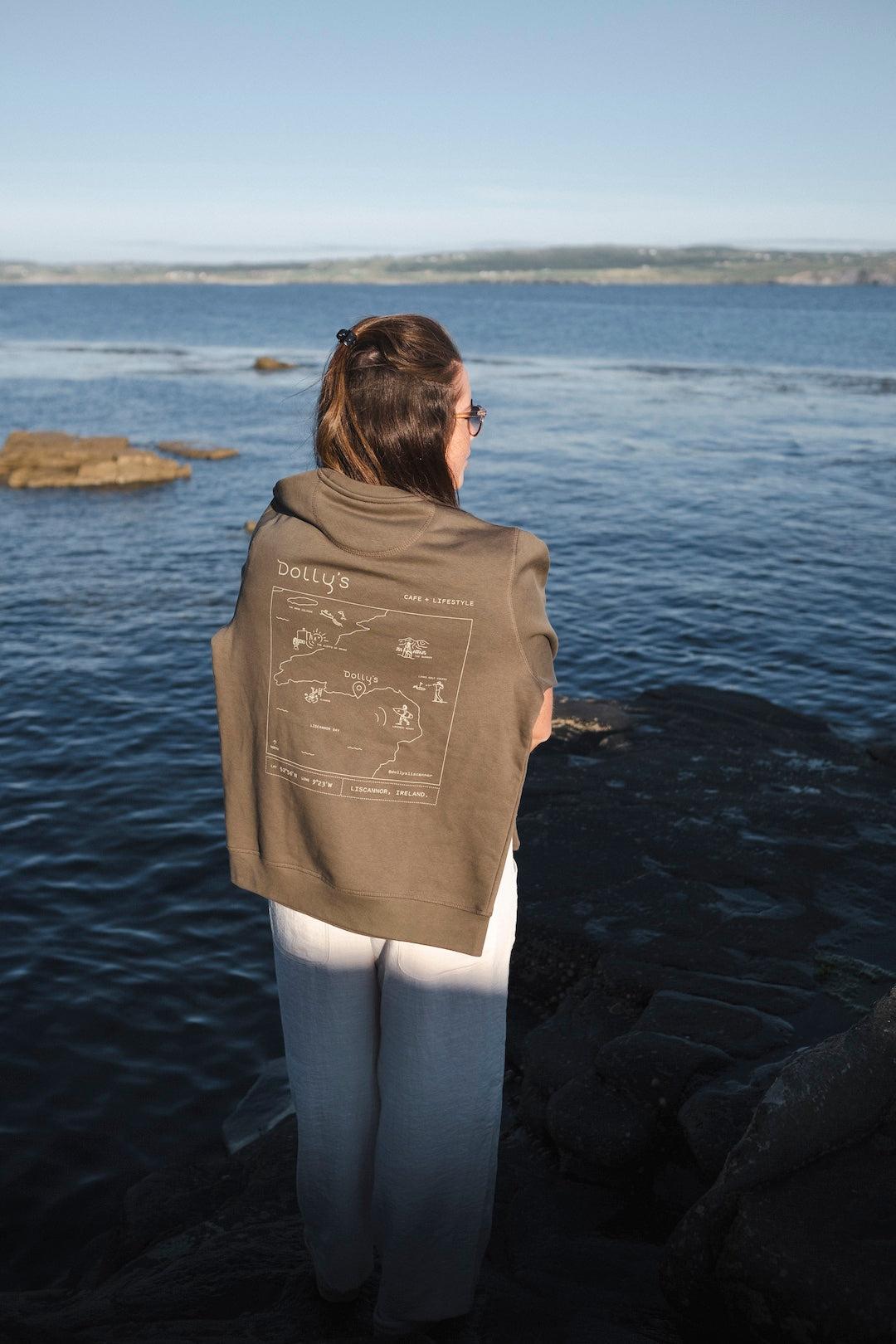 Our unisex Dolly's Map Sweater comes in our signature green colour. Artwork on the back is by local designer ODYSEA Design.